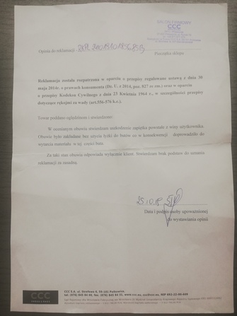 Odmową uznania reklamacji było stwierdzenie, iż obuwie było zakładane bez użycia łyżki. Nie zgadzając się z powyższym wniosłam w dniu 28.10.2019 r. wniosek o ponowne rozpatrzenie reklamacji. Buty były użytkowane zgodnie z zaleceniami producenta. Obuwie zakładane bez u życia łyżki wykazuje załamania zapiętka. W obuwiu reklamowanym nie ma załamań na zapiętkach. Podczas rozpatrywania reklamacji nie wzięto od uwagę trwałości użytego materiału do produkcji obuwia. Buty były używane dosłownie 4 razy. Reklamacja została rozpatrzona nierzetelnie.