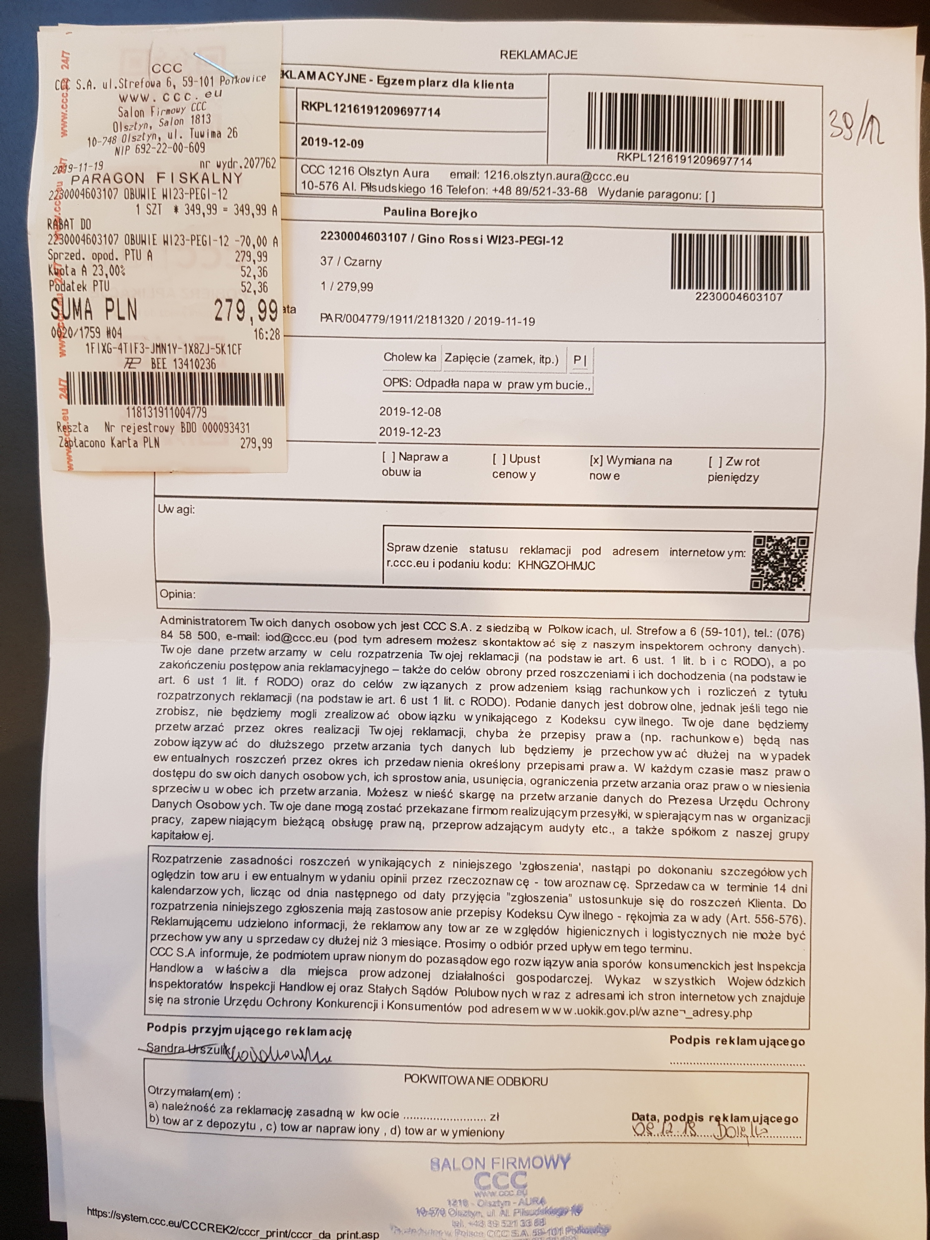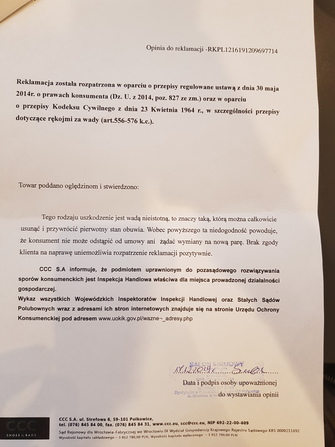 Reklamacja została odrzucona. Nie zgadzam się z następującą treścią: "Tego rodzaju uszkodzenie jest wadą nieistotną, to znaczy, taką którą można całkowicie usunąć i przywrócić pierwotny stan obuwia. Wobec powyższego ta niedogodność powoduje, że konsument nie może odstąpić od umowy ani żądać wymiany na nową parę. Brak zgody klienta na naprawę uniemożliwia rozpatrzenie reklamacji pozytywnie." Buty zakupione za taką kwotę, które nie mają nawet miesiąca czasu, w moim mniemaniu nie będą naprawiane, dlatego rządam wymiany produktu na nowy. Sprzedawca był nie uprzejmy przyjmując reklamację. Po zadaniu pytania czy uznają reklamację od ręki stwierdził, że tak gdy wada jest widoczna. Przedstawiłam argumenty za oraz prosiłam o uznanie reklamacji od ręki, gdyż buty nie mają nawet miesiąca czasu. Poprosiłam o rozmowę kierownika, który stwierdził, iż to nie on, ani żaden z jego pracowników nie ma prawa rozpatrywać reklamacji, tylko są one przekazywane wyżej. Podziękowałam za rozmowę i wyszłam. Wczoraj otrzymałam wiadomość o negatywnym rozpatrzeniu mojej reklamacji. Jestem bardzo roszczeniową osobą i nie pozwolę, żeby traktowano mnie w taki sposób. Jest okres zimowy, sezon przedświąteczny a ja zostaje bez butów, z których nie zdążyłam skorzystać nawet przez 1 miesiąc. Nie mogę sobie pozwolić na zakup nowej pary butów.