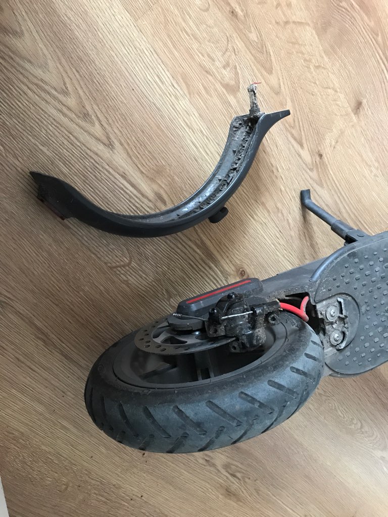 Po przejechaniu 900 km samoczynnie odpadł błotnik. Eleganckie, czyste pęknięcie, ewidentna wada materiału lub nieprawidłowe skręcenie w fabryce. Błotnik nie był uderzony ani na nim nie stawałem, obciążany był tylko podczas przenoszenia (zgodnie z instrukcją obsługi, kierownica zahaczona o hak na błotniku) oraz normalnym wibracjom w trakcie jazdy.