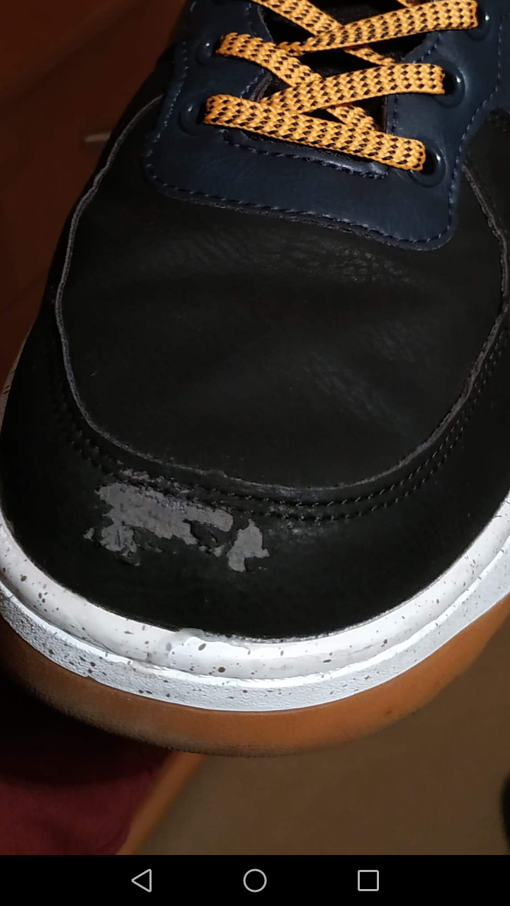 Łuszczenie się materiału z przedniej części lewego buta.