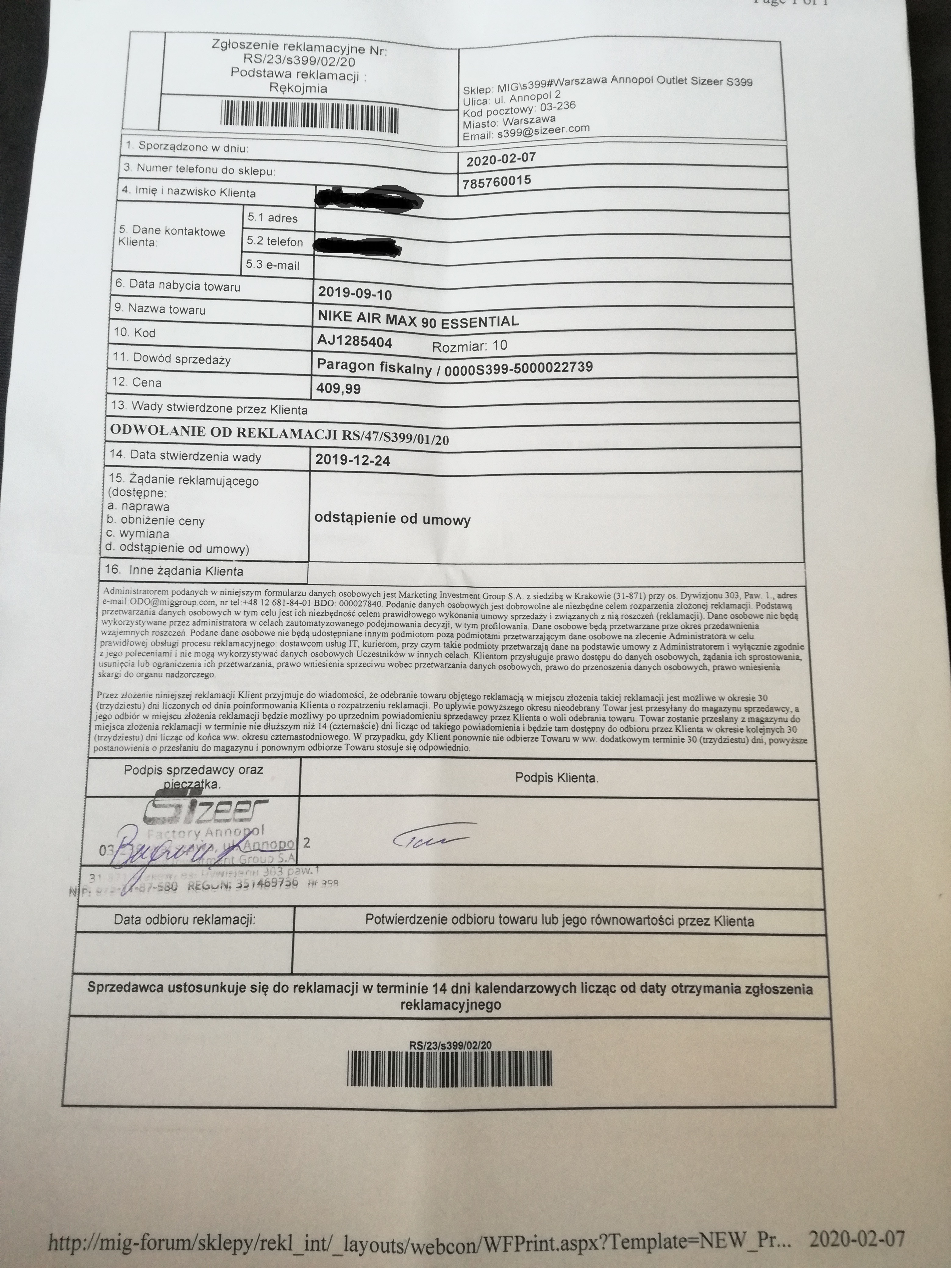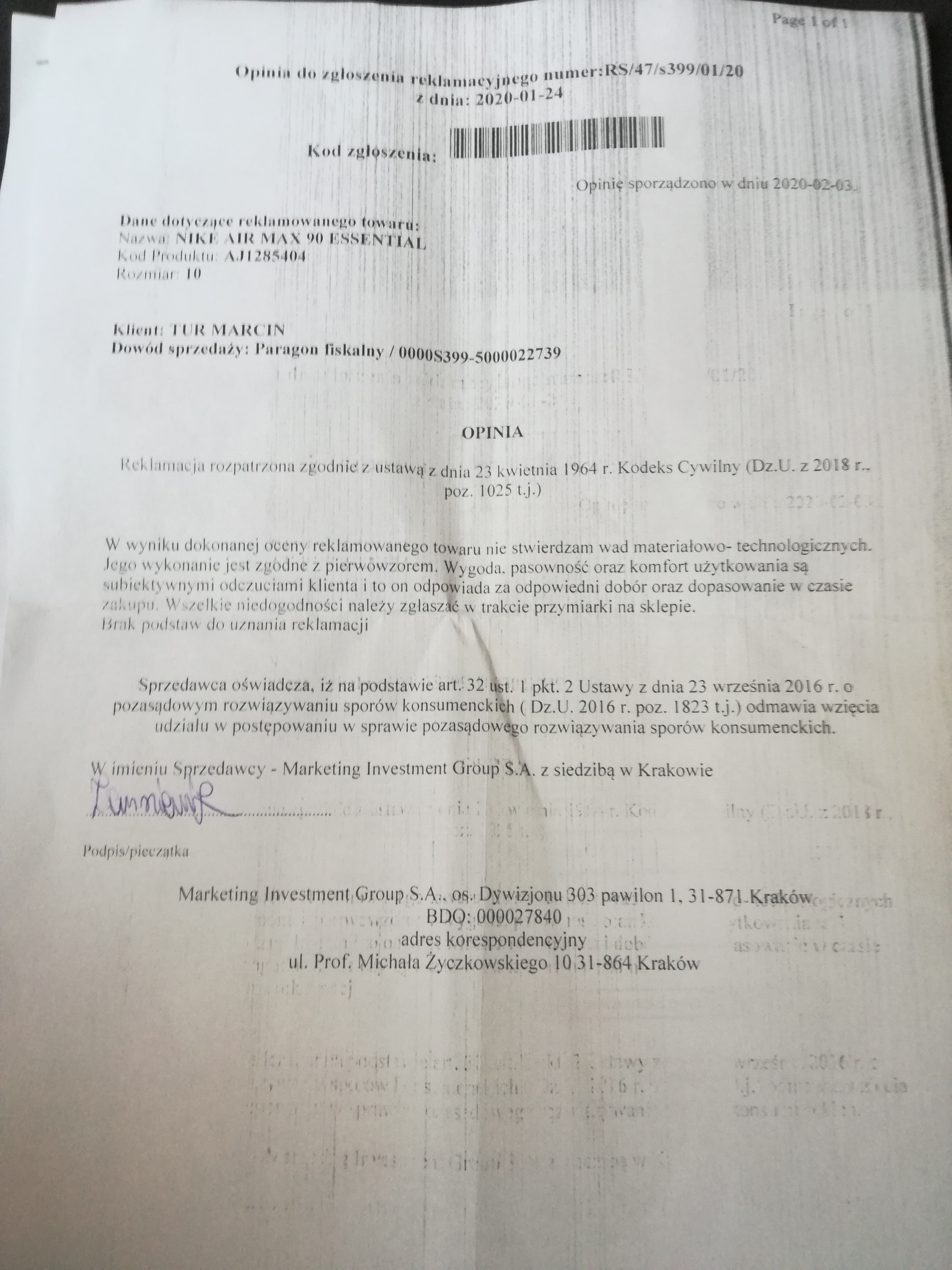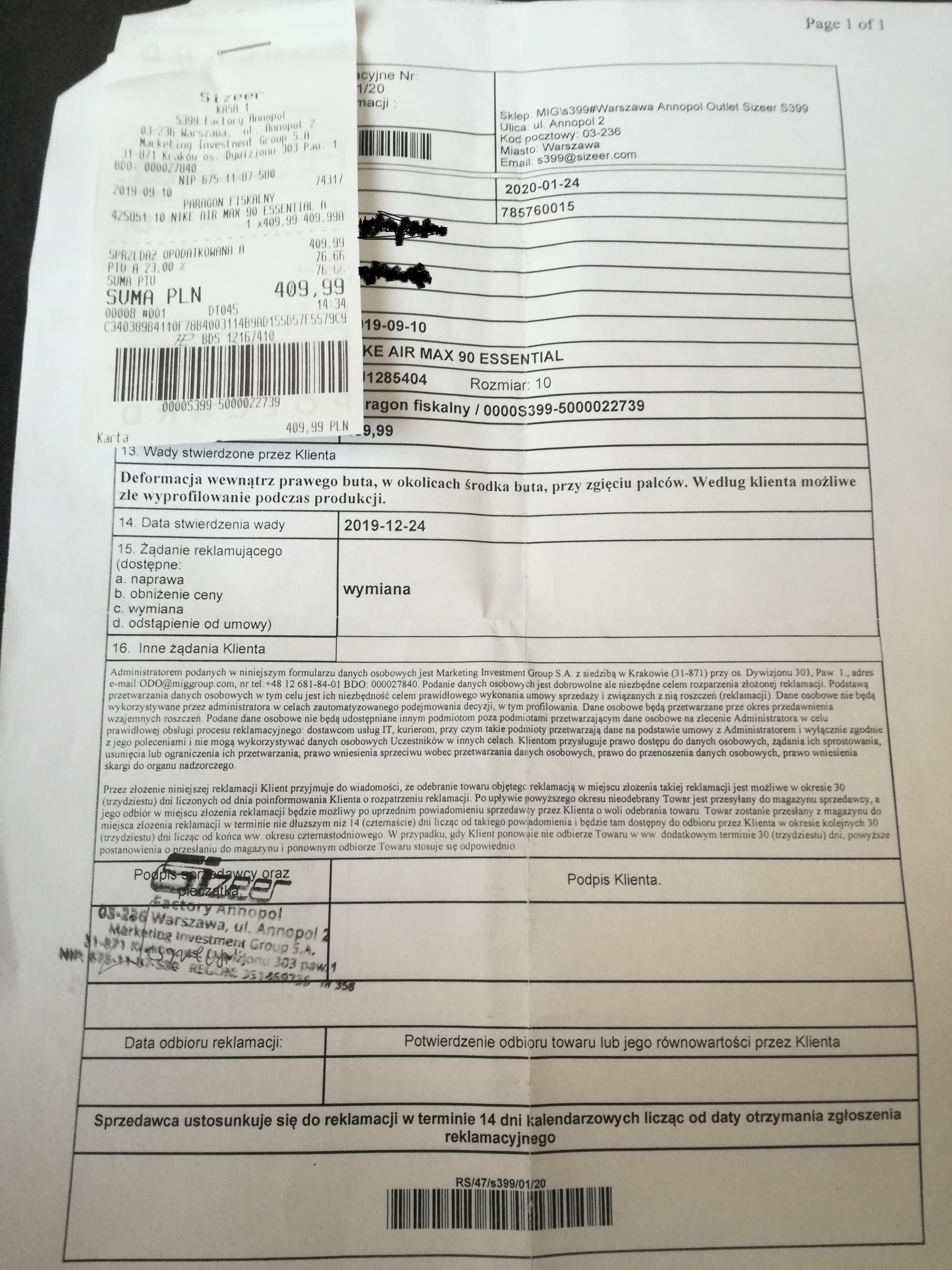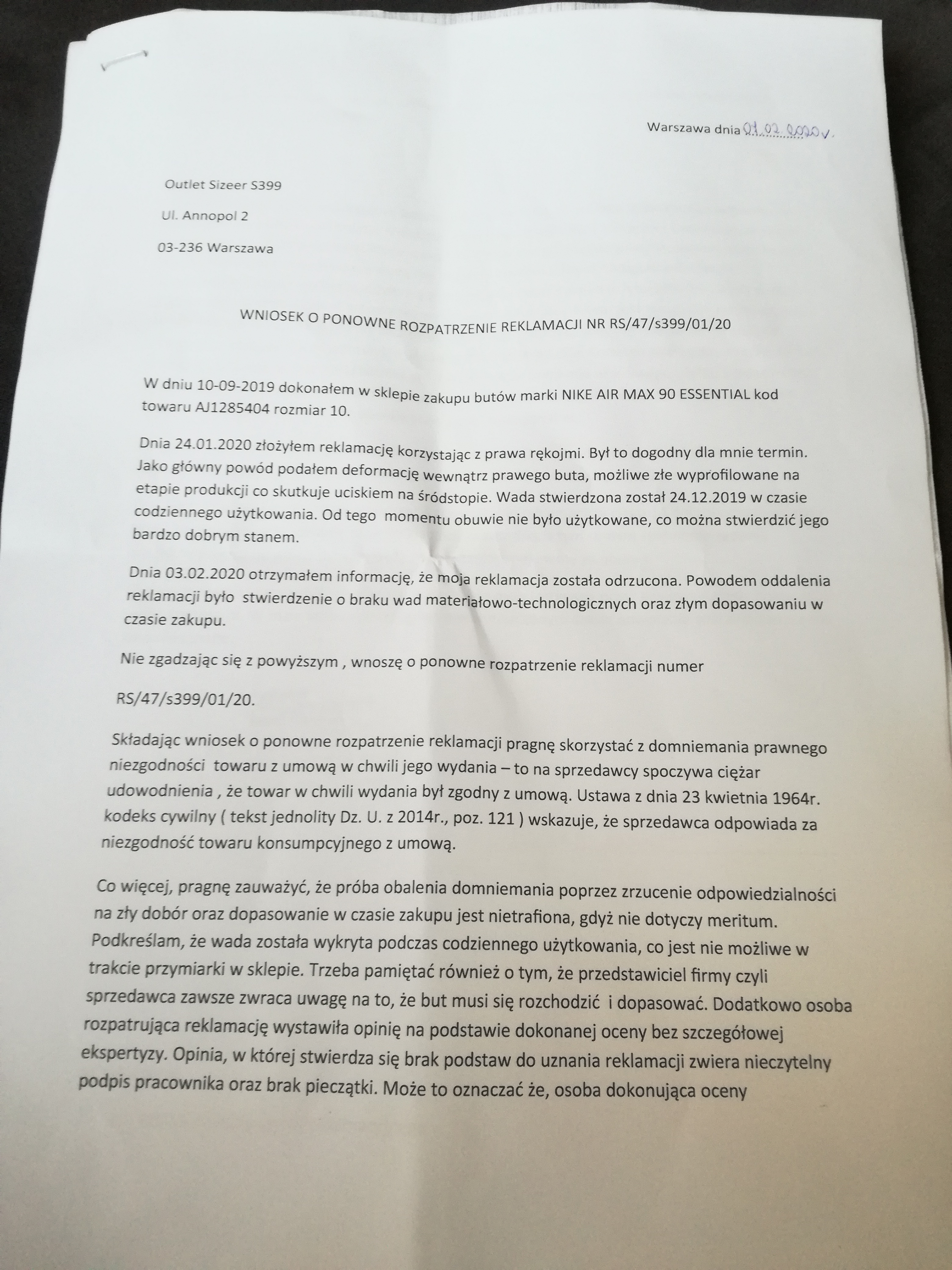 Niezgodność towaru z umową -wniosek o ponowne rozpatrzenie reklamacji RS/47/s399/01/20